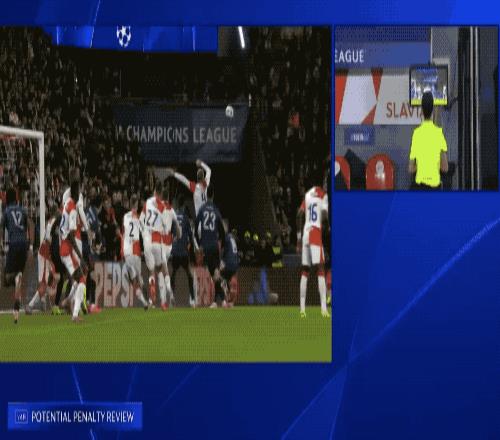 VAR介入,通过慢镜头可以看到,皮球先是砸在防守球员身上,之后才反弹到了张开的手臂上,改变了皮球的走向,裁判判罚点球。