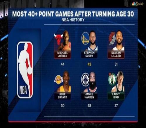 第5、据统计,这是库里30岁后第43次砍下40+,NBA历史第二多,仅次于乔丹(44次)。