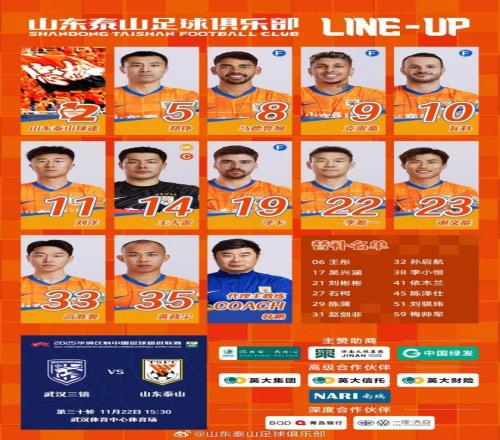 11月22日下午,泰山将在中超最后一轮对阵武汉队,目前双方首发阵容已经出炉,韩鹏派出了全部主力,力争帮助瓦科穿上本赛季金靴。