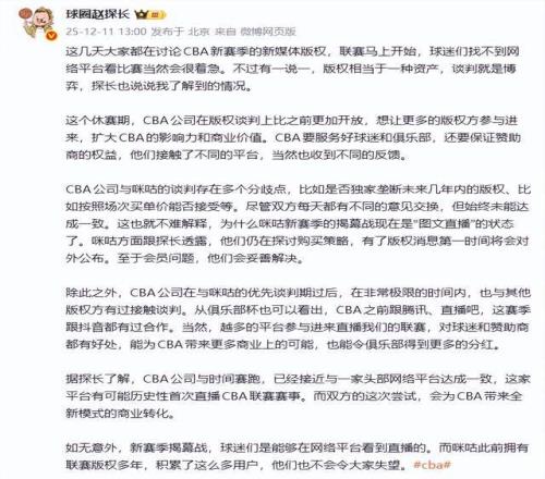 随后,球圈赵探长爆料称,某平台已经接触,准备直播。到了下午2点多,直播吧就给出了最新的消息,直言抖音已获得新赛季的CBA直播版权,将直播每轮部分场次的赛事。