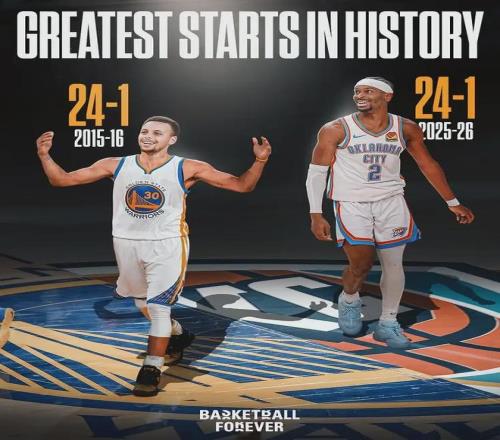 2021-22赛季,雷霆常规赛战绩只有24胜58负。短短四年,西部鱼腩变成了联盟老大。开季前25场比赛,雷霆总净胜分达到了439分,高居NBA历史第一。历史第二是1966-67赛季的凯尔特人380分,第三是2016-17赛季勇士375分。
